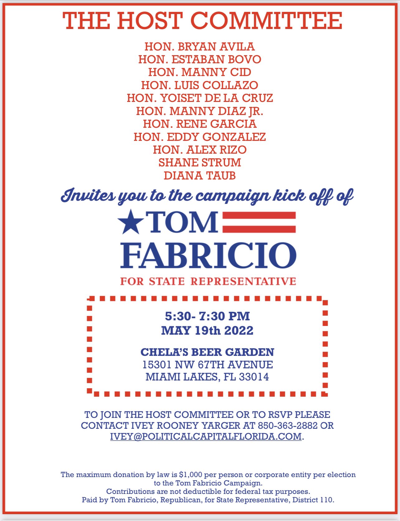 Tom Fabricio On Twitter Please Come Out To My Re Election Campaign Kick Off Fundraiser On May 19 At 5 30pm At Chela S Beer Garden In Miami Lakes Https T Co 2nrafi84by Twitter